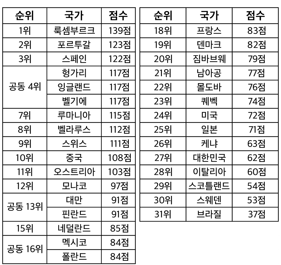 포르투갈은 123점으로 122점을 얻은 이웃 국가 스페인을 근소한 차이로 따돌리고 2위를 차지했으며, 지난해 우승팀인 헝가리를 비롯해 잉글랜드, 벨기에는 117점으로 공동 4위에 올랐다.