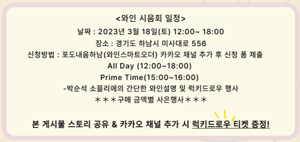 포도내음의 무료 와인 시음회는 ‘포도내음하남’ 카카오채널 검색 후 신청 폼을 제출하면 누구나 참여 가능하며, 관련 문의는 포도내음하남(031-794-7088)으로 하면 된다.