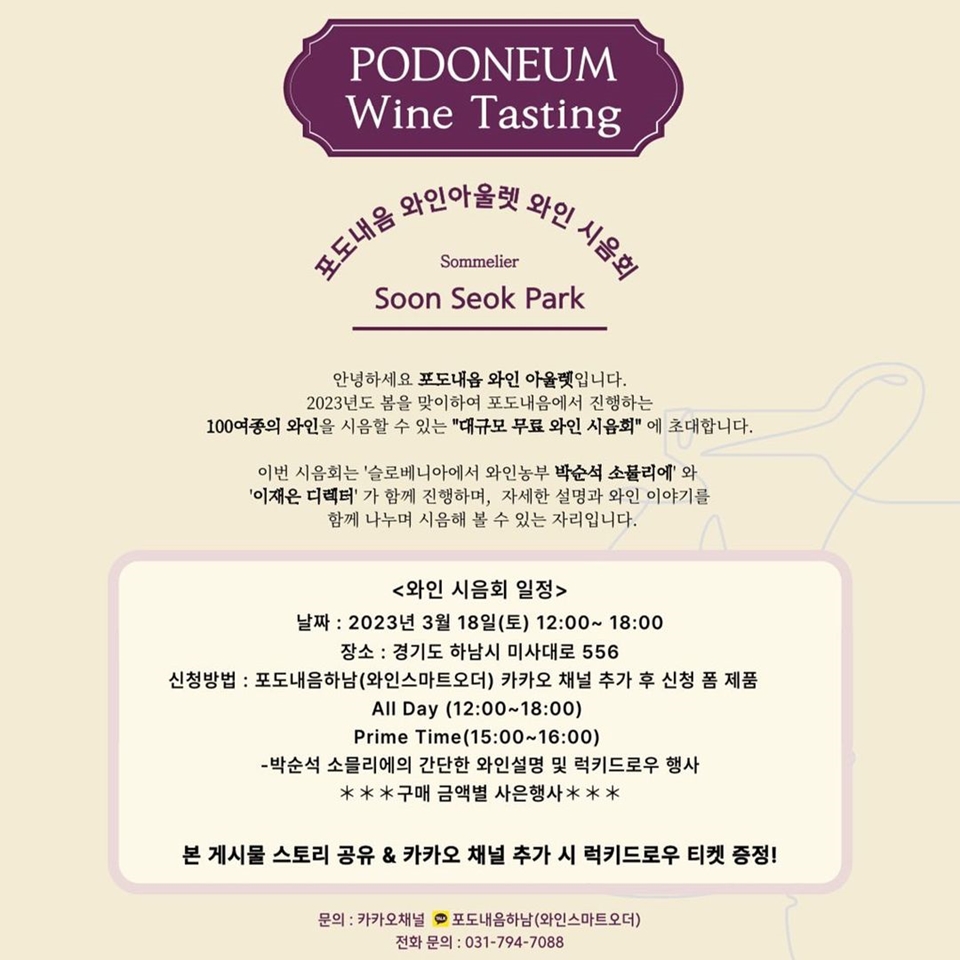 프리미엄 와인 아울렛 ‘포도내음’이 2023년 봄을 맞이하여 100여 종의 다채로운 와인을 맛 볼 수 있는 대규모 무료 와인 시음회를 3월 18일(토) 개최한다.