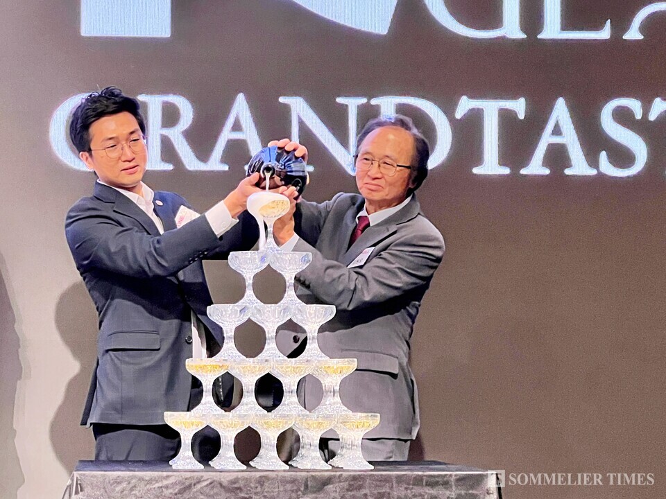 이어 와이넬의 김원오 대표와 김세훈 총괄이사가 함께 샴페인 드 브노쥬 타워 이벤트를 진행하고 관계자들과 와인을 나눠 마시며 그랜드 테이스팅의 시작을 알렸다.