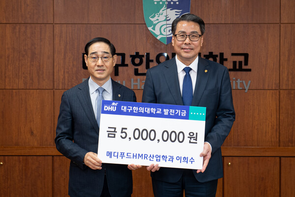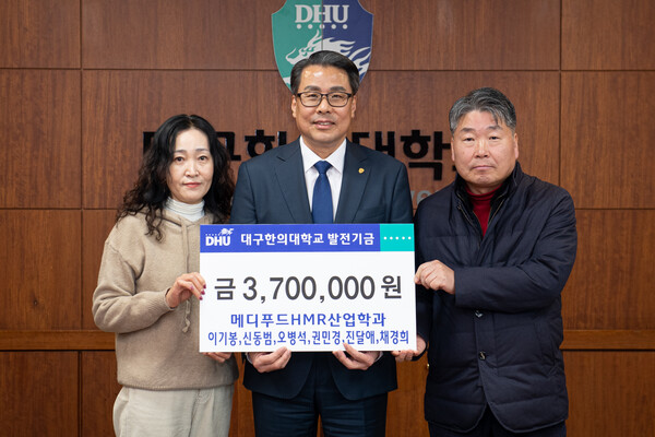 대구한의대학교 메디푸드HMR산업학과는 9일 대학 본관 2층 대회의실에서 재학생(오병석, 진달애, 이기봉, 신동범, 권민경, 채경희)과 학과장 이희수 교수가 함께 학교 발전기금 870만 원을 전달했다. 이날 전달식에는 변창훈 총장과 박동균 대외협력처장(경찰행정학과 교수)이 참석했으며, 이외에도 4개 학과의 교수 및 재학생들이 함께 발전기금을 전달하는 뜻깊은 시간을 가졌다.