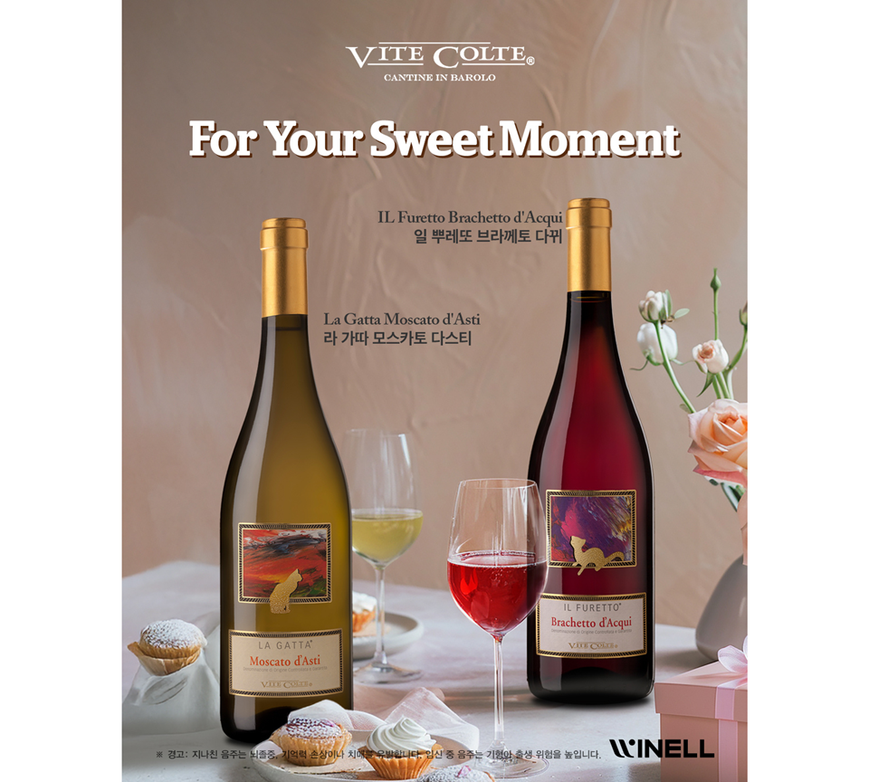 비떼 꼴떼의 포도밭을 지켜보는 고양이처럼, 향긋한 꽃과 과일 아로마를 가진 달콤한 모스카토 와인. 섬세한 버블이 매력적이며, 생크림 케이크나 마카롱과 완벽한 조화를 이룬다.