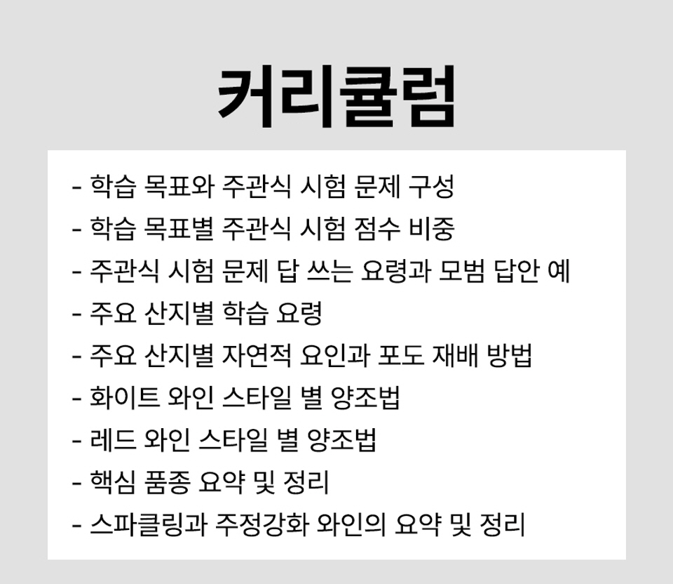 WSET Level 3 이론 시험 준비반은 명확한 커리큘럼과 WSA와인아카데미가 직접 제작한 WSET Level 3 정리 노트도 함께 제공하고 있어 매월 WSET 시험을 앞둔 수강생들에게 전체 과정의 총정리와 실전 감각을 키우며 부족했던 부분을 보완할 수 있는 시간이 될 것이다.