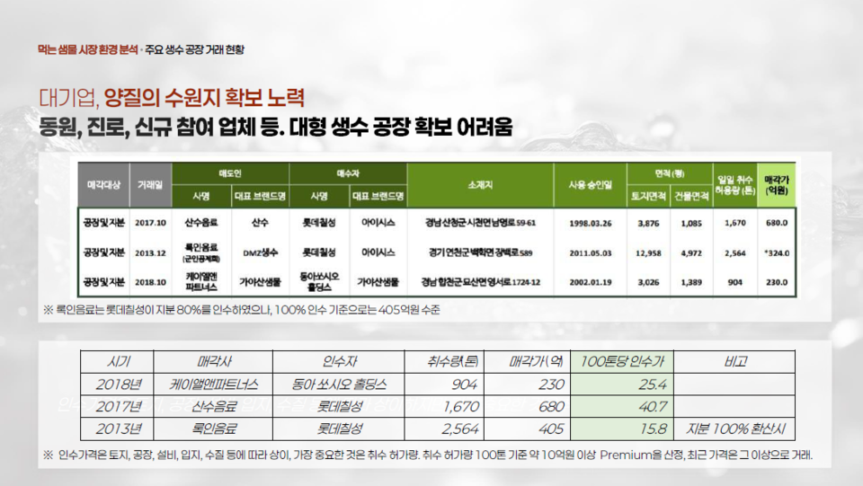 Q. 지금 생각해보면 정말 상상도 할 수 없는 일이네요. 먹는샘물 공장 M&A는 생소한 분야입니다. 한편으로는 먹는샘물 공장만큼 미래 지향적인 투자가 없을 것 같은데요. 먹는샘물 공장의 투자 가치에 대해서 어떻게 생각하시나요?