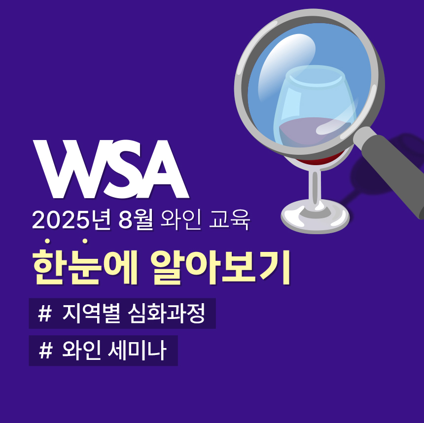WSA와인아카데미에서는 2025년 8월 다양한 주제로 와인 세미나와 시음회, 와인 심화과정을 진행하고 있습니다.