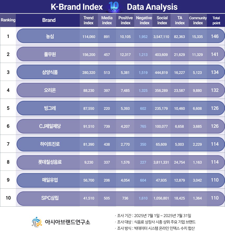 이번 K-브랜드지수 식음료 상장사 부문은 식음료 상장사 시총 상위 주요 기업 브랜드를 대상으로, 2025년 7월 1일부터 7월 31일까지의 온라인 빅데이터 1190만 1619건을 분석했다.