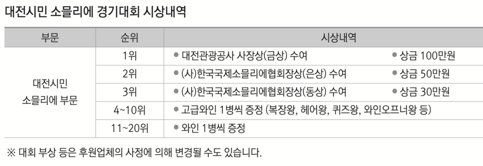 10월 24일(금)의 예선과 25일(토) 결선까지 양일간 진행되는 대전시민 소믈리에 경기대회에서는 주민등록상 거주지가 대전시로 되어 있는 20세 이상의 시민, 대전 소재의 대학교 재학생, 대전 소재 회사의 직장인이라면 누구든 참여할 수 있다.