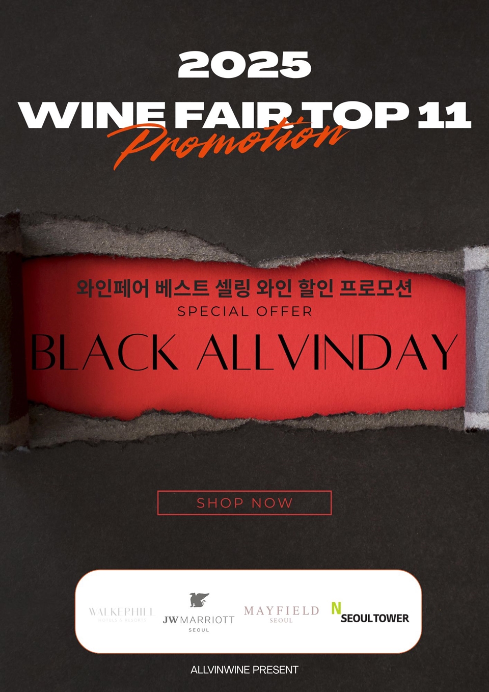 ‘2025 WINE FAIR TOP 11 PROMOTION – BLACK ALLVINDAY’라는 타이틀 아래 진행되는 이번 프로모션은, 올해 와인 시장에서 가장 높은 반응을 얻은 제품을 한자리에서 만나볼 수 있는 기회로, 연말 시즌 리테일 및 F&B 업장을 대상으로 진행된다.
