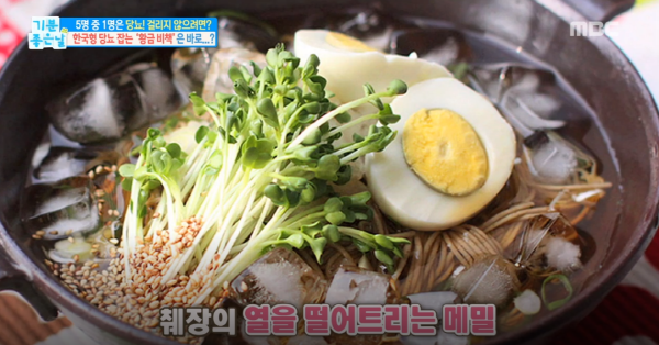 바로 ‘메밀가루’였다. 한동하 한방내과 전문의는 동의보감에서 가장 성질이 차가운 곡물이 바로 메밀이라고 말했다. 실제로 메밀을 여름에 먹으면 좋다고 하는데, 이는 췌장의 열을 떨어트리기 때문이라고 하며, 원활한 인슐린 분비를 도와 혈당 수치까지 낮춰준다고 한다.