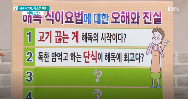 19일, KBS ‘무엇이든 물어보세요’에서는 해독 식이요법에 대한 오해와 진실로, 해독 식이요법에 대한 잘못된 상식과 올바른 상식 등이 공개됐다.